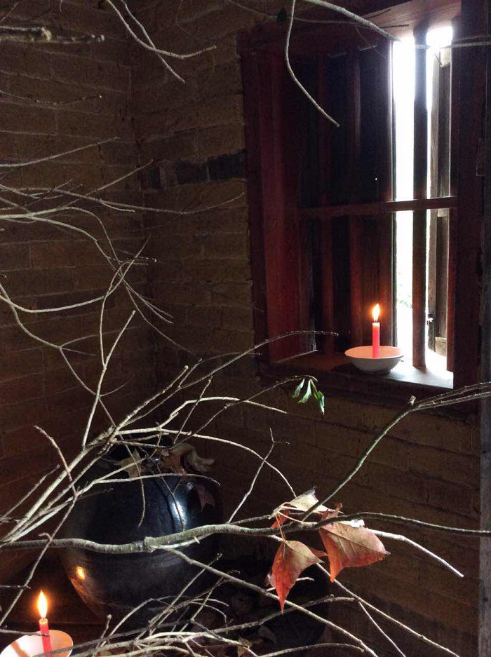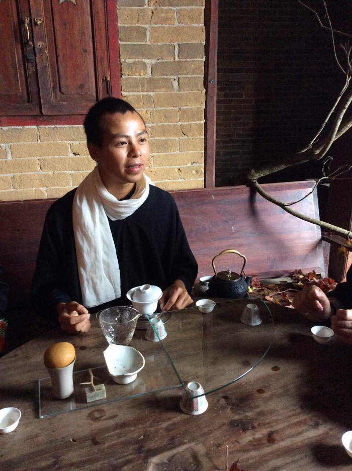 從京城歸來,北方已大雪紛飛,我在南方山城難覓一片紅楓。用了一天時間,周轉于山城各處,鮮少看見黃了頭的楓葉,經友人介紹,在二十公里開外的山上,僅有的兩棵紅楓屹立山腰,隔山相望分外惹人眼。同修們倍覺時間緊迫,從得知省市作家采風團的行程,到"靜里春秋"茶會的呈現,只有兩天的策劃與籌備。"十二時如何用心?",趙州云:"諸人被十二時辰使,老僧使得十二時辰"我無暇去思考時間的緊迫,用了一天去尋找紅楓,用了另一天,挑選場地和布置。安住當下的心,專注手里的枯枝紅楓。清代鄭板橋用"眼中之竹"-"胸中之竹"-"手中之竹"論繪畫意境創造的階段。我們借一片紅楓,把中國山水畫荒天邃古之境引入室內,茶桌一圓一方,老樹根凳子,用落滿一地的紅楓營造這靜絕的氣氛。作家從觀光采風景點走入靜絕的境界,心靈由躁動歸于平和,于靜寂中自在,與手里的茶湯同在,與天地同在。